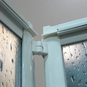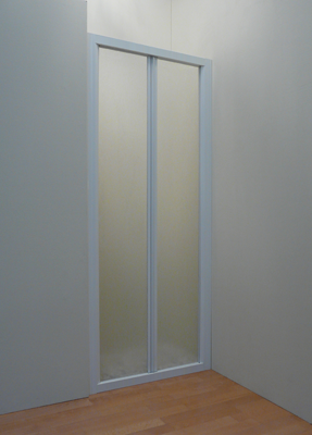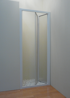 Mampara de dos hojas plegables o abatibles para conseguir una mayor apertura en los huecos pequeños, cuenta con un sistema de bisagras e imanes que deslizan con un carro de ruedas por las guías tanto superior como inferior, y además es reversible. Cuenta con la posibilidad de hacer el conjunto frontal + fijo tanto en recto como en ángulo.