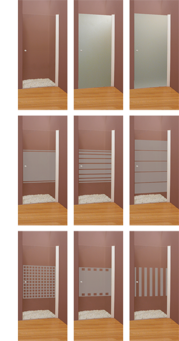 Los distintos acabados en los que se pueden fabricar nuestras mamparas se pueden combinar, tanto en color de la perfilería como la decoración del vidrio o el tipo de acrílico.